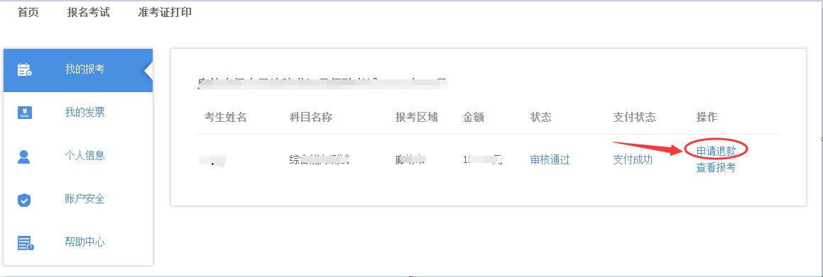 (二)进入主页面后,点击【我的报考】,在“我的报考”列表中找到“2022年度第2次365BETAPP官网_365平台网页版登录官网_365的账户被关闭专业技术人员计算机水平测试”报考记录,点击该报考记录对应的【申请退款】按钮,进行网上退款申请。退款申请流程示意图如下: